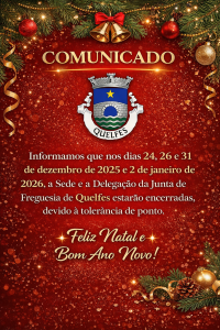 Informamos que, nos dias 24, 26 e 31 de dezembro de 2025 e 2 de janeiro de 2026, a Sede e a Delegação da Junta de Freguesia de Quelfes estarão encerradas, devido à concessão de tolerância de ponto.